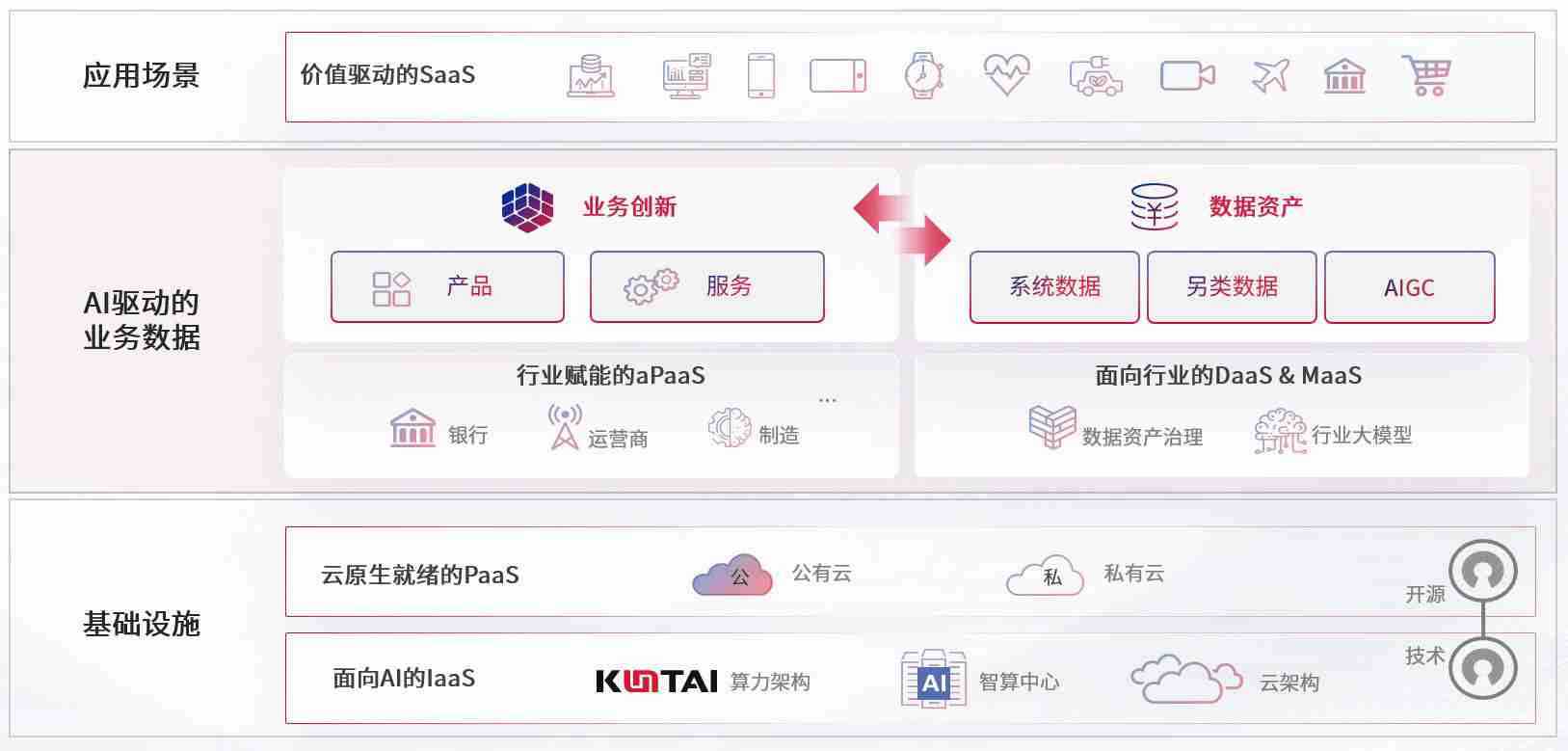 数字时代,,围绕企业数字化转型的关键要素,,,98堂论坛数码开创性的提出数云融合战略和技术体系框架,,,,着力在云原生、、、数字原生、、、AI原生和信创产业上架构产品和服务能力,,为处在不同数字化转型阶段的快消零售、、、汽车、、、、金融、、、医疗、、、政企、、教育、、、运营商等行业客户提供泛在的敏捷IT能力和融合的数据驱动能力,,,构建跨界融合创新的数字业务场景和新业务模式,,助力企业级客户建立面向未来的核心能力和竞争优势,,全面推动社会的数字化、、、、智能化转型升级。。。